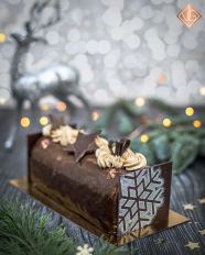 Pour les gourmands: bûche Voltaire de chez Pâtisserie VG un moelleux chocolat, croustillant speculoos, mousse au caramel, pain d’épices, compotée de poires biologiques, glaçage miroir au chocolat noir.