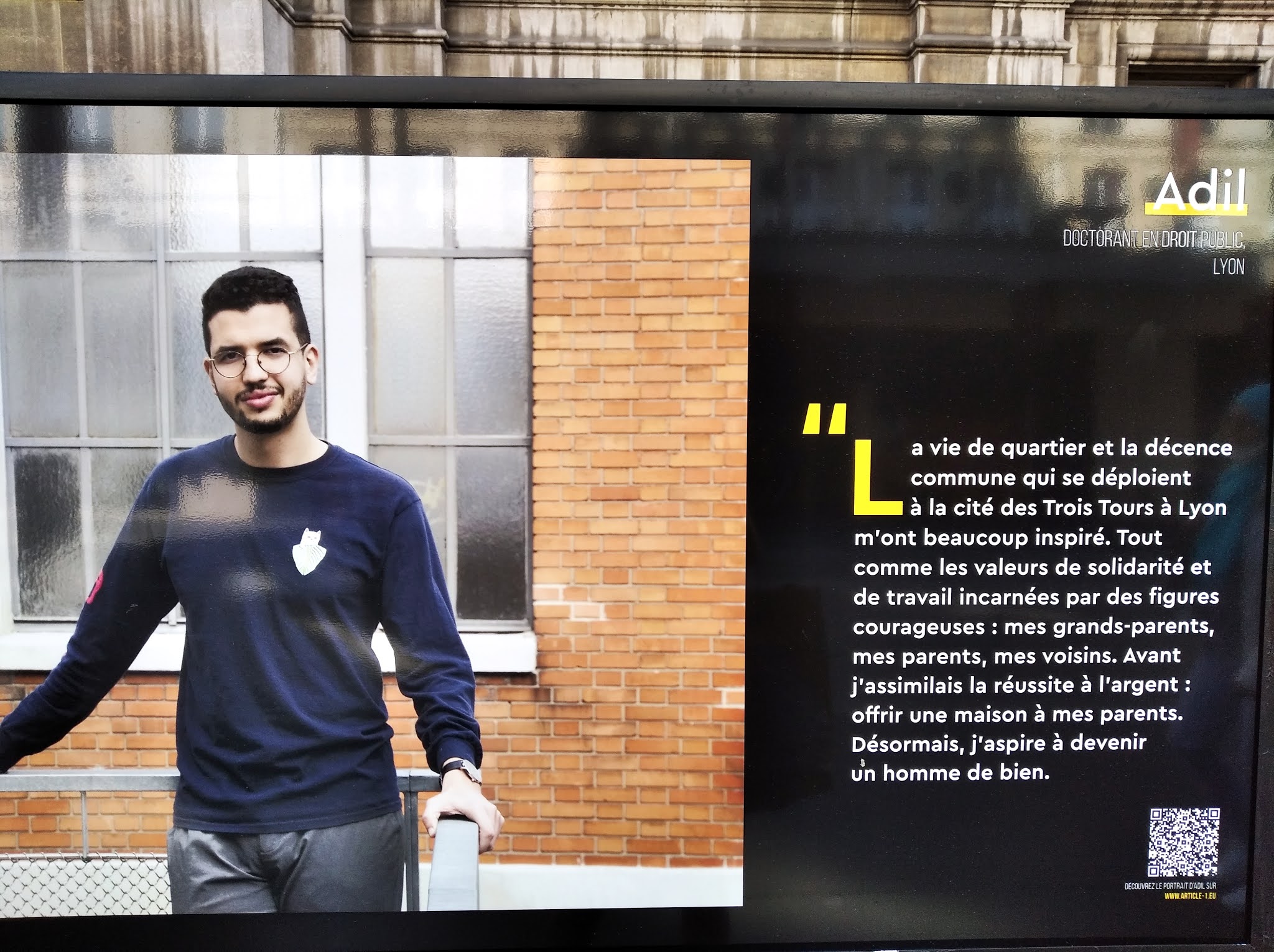 « La vie de quartier et la décadence de la commune qui se déploient des Trois Tours à Lyon m’ont beaucoup inspiré. Tout comme les valeurs de solidarité et de travail incarnées par des figures courageuses : mes grands-parents, mes parents, mes voisins. Avant, j’assimilais la réussite à l’argent : une maison à mes parents. Désormais, j’aspire à devenir un homme de bien ». ADIL doctorant en droit public Lyon.