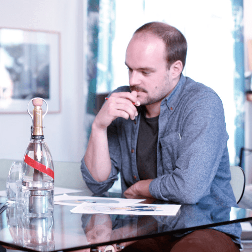 Fondateur de l’agence Spade, spécialisée dans le design d’objets spatiaux, Octave de Gaulle, arrière-petit-neveu du général, a travaillé près de trois ans sur sa bouteille. Elle est ainsi en verre transparent, composée de deux parties. La plus haute est remplie de champagne. La partie inférieure est dotée d’un mécanisme sur lequel il faut appuyer avec le doigt pour mettre la bouteille sous pression et libérer de petites quantités de champagne.