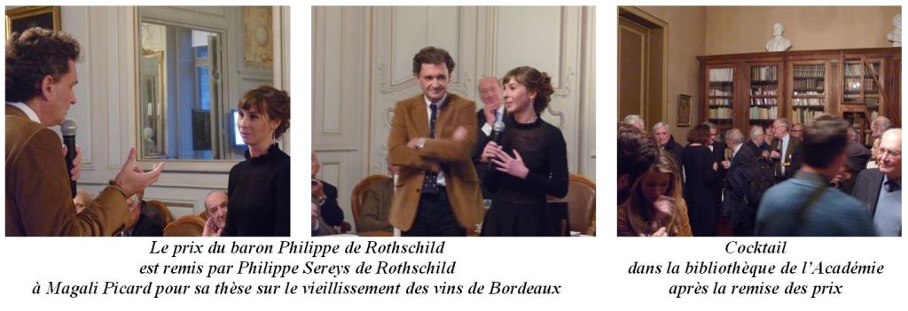 Le Baron Philippe de Rothschild a été membre de l’Académie de Bordeaux de 1973 à 1988, et avait institué un prix destiné à couronner un ouvrage consacré à l’histoire ou à la célébration du vin. Plutôt qu’un ouvrage, c’est une thèse qui a été choisie en 2016 pour ce prix: https://academie-sbla-bordeaux.fr/prix-2016/